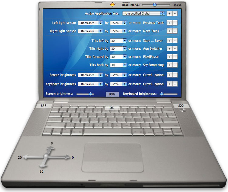 When triggering an AppleScript action, Lilt can pass the name of the sensor, the current reading and the previous reading. In this way you can build complex actions in your AppleScripts to do different things based on the degree of the sensor reading. In other words, with an if-then-else block you could, for instance, go to the next iTunes track if the machine tilts right by 10 or more but if it tilts 50 or more, you could fast forward 5 seconds through the current track.